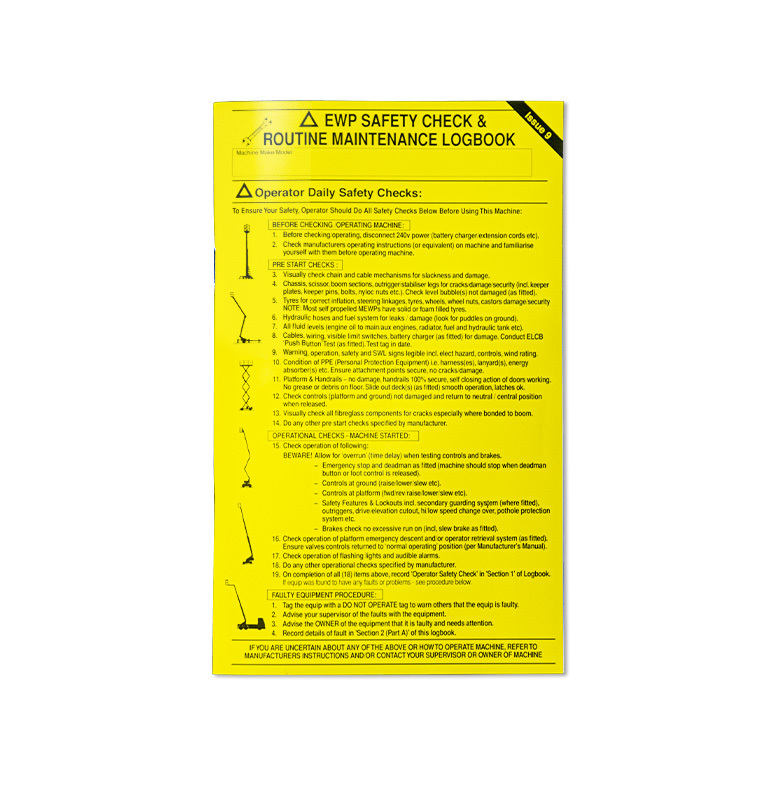 EWP safety check and routine maintenance logbook.